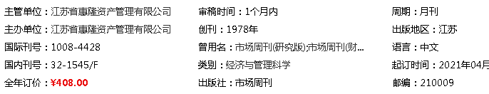 《市场周刊(理论研究)》杂志是经国家新闻出版总署批准、由江苏省惠隆资产管理有限公司(江苏省物资集团)主管主办的省一级综合类学术期刊。杂志内容丰富,印刷精美,雅俗共赏,集学术性、实用性、权威性、前瞻性与专业性于一体,具有很高的学术价值和社会影响力,读者遍布全国各科研机构、高等院校及企事业单位。